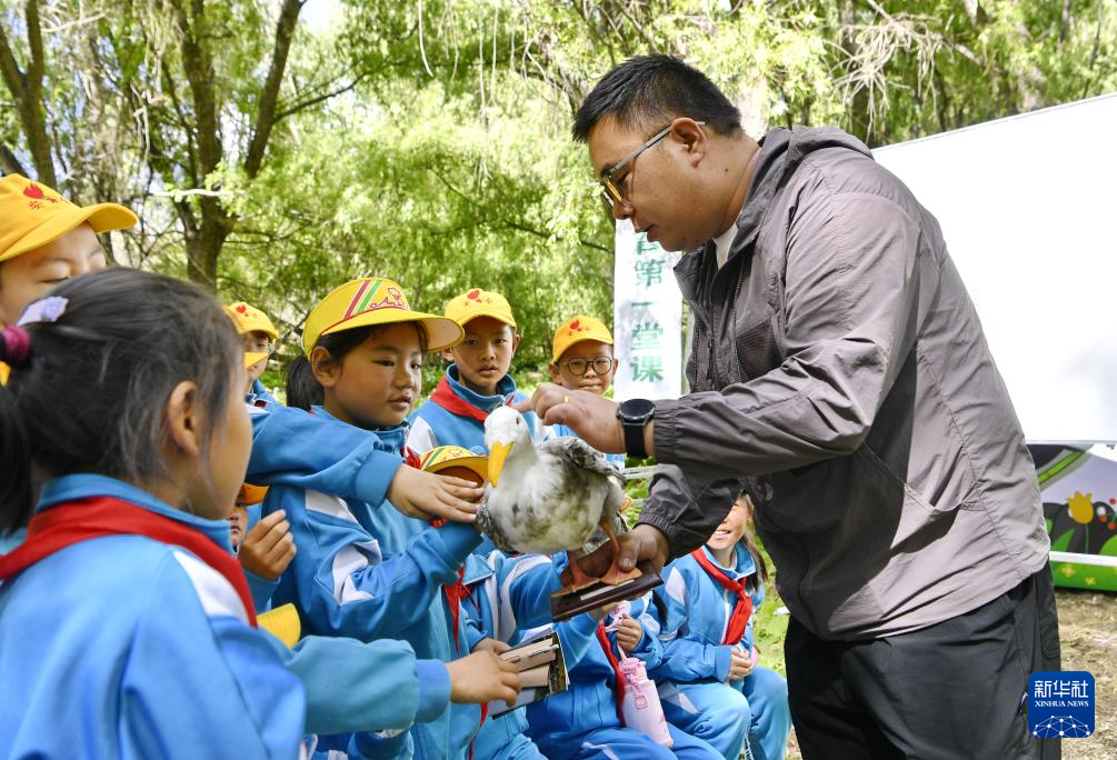 5月22日,西藏大學(xué)生態(tài)環(huán)境學(xué)院助理實驗師朱文琎向小學(xué)生展示鳥類標(biāo)本。新華社記者 張汝鋒 攝