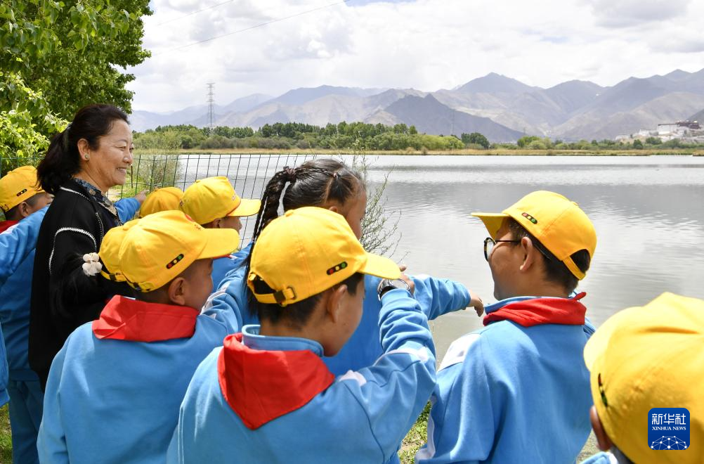 5月22日,拉魯小學(xué)師生一起觀賞拉魯濕地美景。新華社記者 張汝鋒 攝