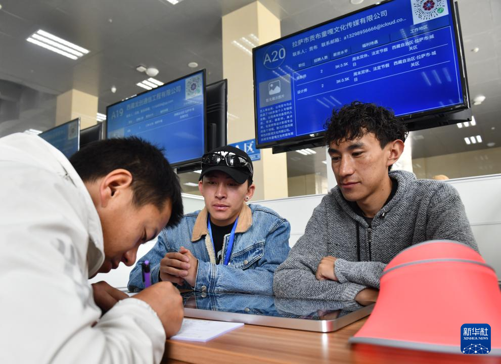 5月24日,在招聘會(huì)現(xiàn)場(chǎng),求職者(左)在給用人單位填寫個(gè)人資料。新華社記者 晉美多吉 攝