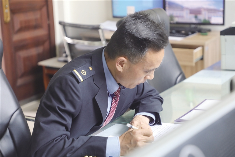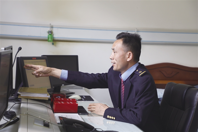 “這里的工作雖然看似單調(diào),實則責(zé)任很大。”賀文貴身穿深藍色的鐵路制服,胸前佩戴著亮閃閃的工牌,顯得精神抖擻。他像一名嚴謹?shù)膽?zhàn)士,緊盯著操作臺,確認信號,口呼手指?!∽鳛檐囌局蛋鄦T,賀文貴每天的任務(wù)主要是監(jiān)視列車進路和區(qū)間動態(tài),保證行車安全。工作中的他認真負責(zé),嚴格執(zhí)行標準化作業(yè),他常說:即使單人值守,該有的程序、作業(yè)步驟一項都不少,作業(yè)標準必須嚴格執(zhí)行,保證作業(yè)安全。