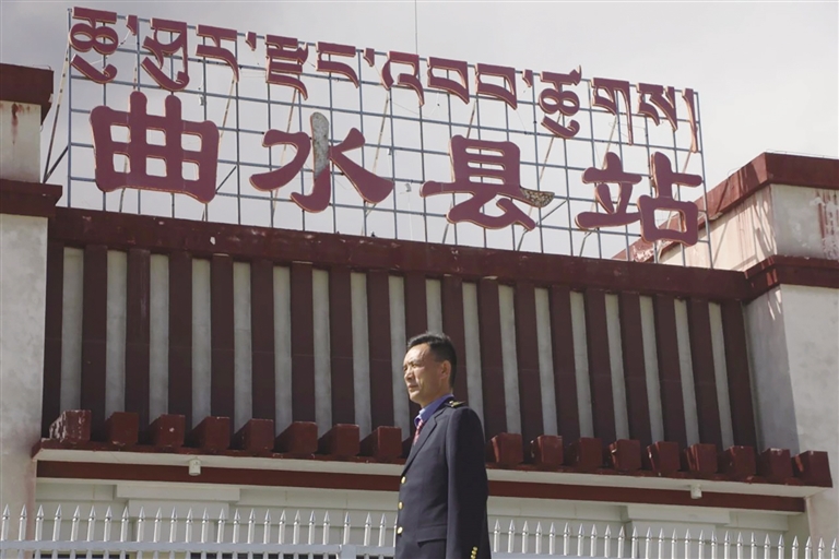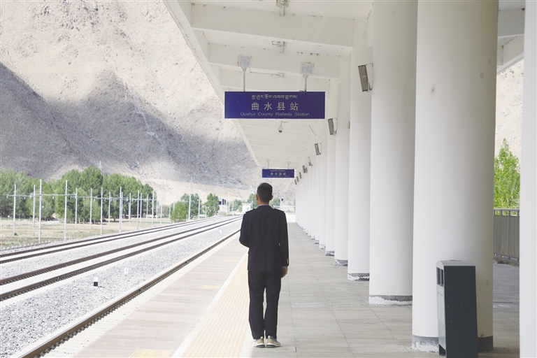 每天,清晨的第一縷陽光還未穿透遠方的山巒時,車站值班員賀文貴已經(jīng)站在曲水站的站臺上,開始了他日復(fù)一日的工作,查看股道是否有異物,是否有動物進入站場。曲水站與其他站不一樣,根據(jù)工作安排,平時這里只有一個人當(dāng)班應(yīng)急值守,沒有旅客上下站,時而駛過的火車,是這里唯一的來客。目之所及,只有遠處的雪山、農(nóng)田和滾滾向前的雅魯藏布江水。