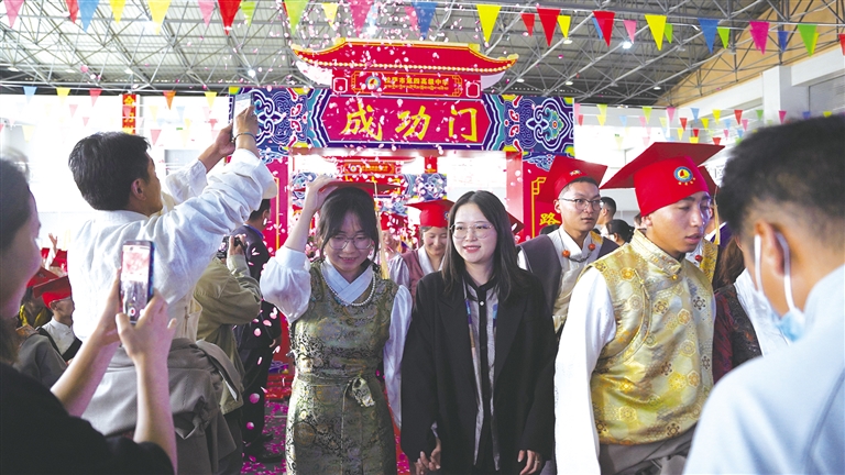 活動現(xiàn)場,每一位即將畢業(yè)的學(xué)生都要穿過象征著“成人、成才、成功”的三道門。家長代表手捧鮮花,不停地叮囑著孩子;老師們眼眶濕潤,看著即將離校的學(xué)生,充滿了不舍和期待。此刻,千言萬語涌入心間,匯成美好的期盼。
