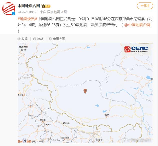 中國地震臺網(wǎng)正式測定:06月01日08時46分在西藏那曲市尼瑪縣(北緯34.14度,東經(jīng)86.36度)發(fā)生5.9級地震,震源深度8千米。