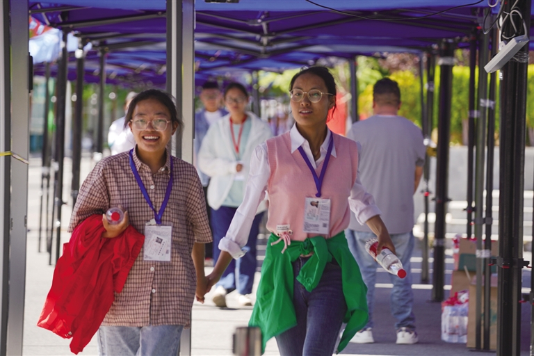擊掌、擁抱……拉薩中學(xué)考點(diǎn)附近處處是為考生們加油的老師、家長。有些家長身著旗袍,有的老師手拿向日葵……給孩子加油打氣。