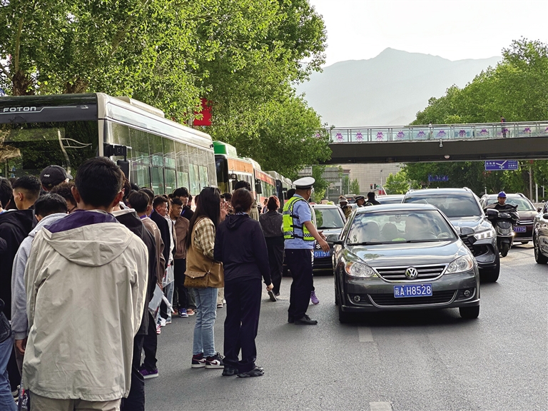 6月7日8點(diǎn),太陽剛剛升起,拉薩中學(xué)考點(diǎn)附近人頭攢動。一輛輛愛心送考的公交車依次停靠在馬路邊,學(xué)生們排隊等候安檢進(jìn)場,考點(diǎn)大門口的喇叭重復(fù)播放著考生進(jìn)考場的溫馨提示。