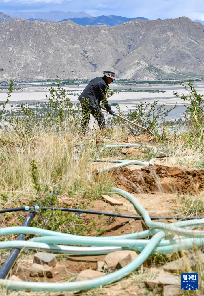6月3日,在拉薩南北山綠化2024年度一期工程貢嘎縣造林項目貢嘎2號片區(qū),當(dāng)?shù)卮迕裨谠詷湓炝?。新華社記者 晉美多吉 攝