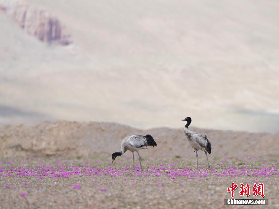 6月12日,西藏那曲市申扎縣黑頸鶴在花叢中覓食。申扎縣,平均海拔超過4500米,是黑頸鶴在中國的主要繁殖地之一。每年4月到6月,成群的黑頸鶴會來到這里,筑巢、孵化、養(yǎng)育下一代。近年來,為了保護這些珍貴的生靈,申扎縣采取了一系列措施,設(shè)立了監(jiān)測站,對黑頸鶴的棲息地進行24小時監(jiān)控,確保它們的繁殖不受干擾。黑頸鶴是國家一級保護動物,也是世界上唯一一種生長、繁殖在高原的鶴類。貢嘎來松 攝