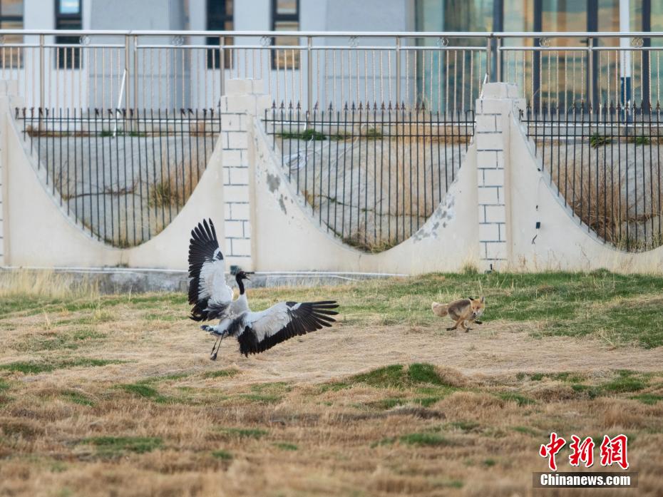 6月12日,西藏那曲市申扎縣濕地里一只黑頸鶴在驅(qū)趕狐貍。申扎縣,平均海拔超過4500米,是黑頸鶴在中國的主要繁殖地之一。每年4月到6月,成群的黑頸鶴會來到這里,筑巢、孵化、養(yǎng)育下一代。近年來,為了保護這些珍貴的生靈,申扎縣采取了一系列措施,設(shè)立了監(jiān)測站,對黑頸鶴的棲息地進行24小時監(jiān)控,確保它們的繁殖不受干擾。黑頸鶴是國家一級保護動物,也是世界上唯一一種生長、繁殖在高原的鶴類。貢嘎來松 攝