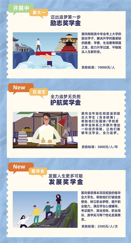 在這樣的背景下,今年夏天“勵志學子追夢計劃”升級為“夢想+”大學生助力計劃,項目模式從“一次性資助”升級為“全學段全方位幫助”,即在繼續(xù)幫助大一勵志學子過渡升學的基礎上,增加了對在讀大學生的持續(xù)幫助、臨畢業(yè)生的自我提升就業(yè)幫助等,希望能夠助力勵志學子們更從容自信地迎接新生活、新挑戰(zhàn),全面發(fā)展,勇敢追夢。