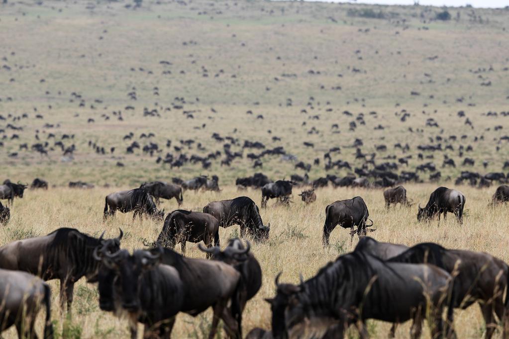 ↑ 在馬賽馬拉國家保護(hù)區(qū),遷徙中的野生動物在草原上覓食。