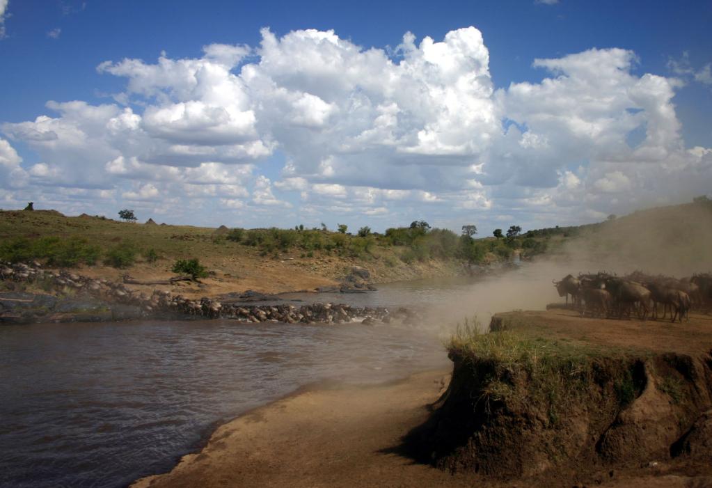 ↑ 在馬賽馬拉國家保護(hù)區(qū),遷徙中的角馬越過馬拉河。