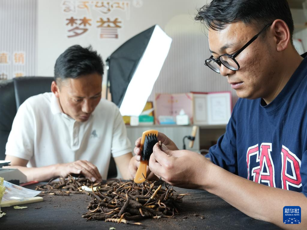 5月31日,在西藏拉薩市,藏族青年羅拉(右)在公司內清潔新鮮蟲草。新華社記者 丁汀 攝
