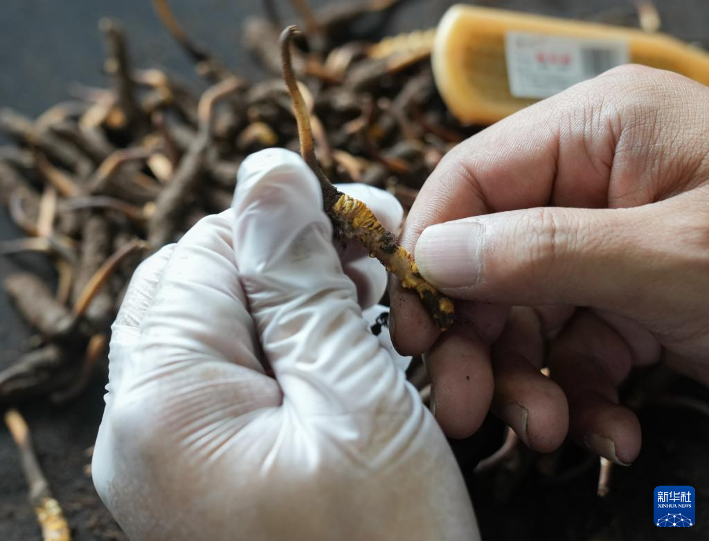5月31日,在西藏拉薩市,藏族青年羅拉在公司內清潔新鮮蟲草。新華社記者 丁汀 攝