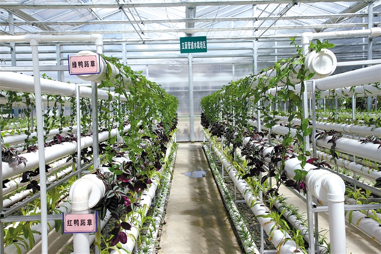 上海援建的江孜縣紅河谷農(nóng)業(yè)科技示范園區(qū)內(nèi)的立面管道水栽培區(qū)。