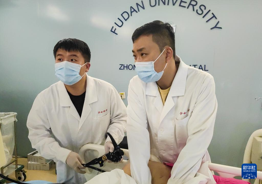 在復(fù)旦大學(xué)附屬中山醫(yī)院,段穎騫(左)在老師胡健衛(wèi)的指導(dǎo)下進行內(nèi)鏡手術(shù)(6月26日攝)。新華社記者 龔雯 攝