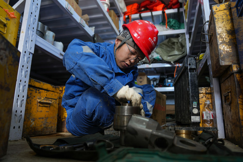 7月11日,機修工柴智敏在維修水接頭。新華社記者 晉美多吉 攝