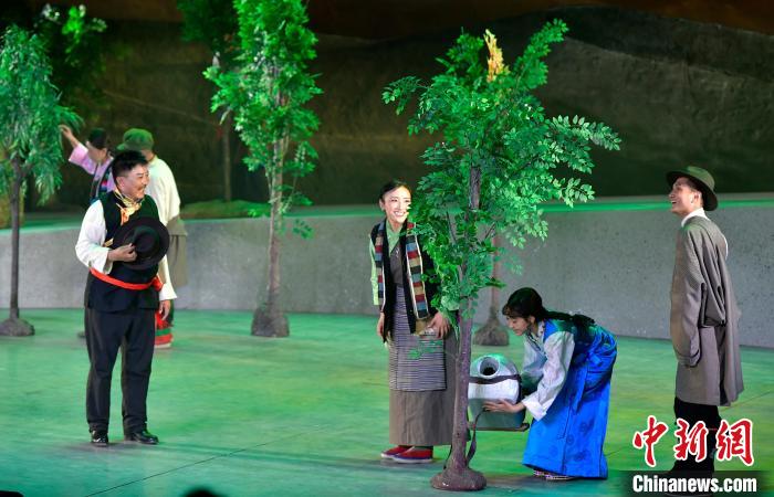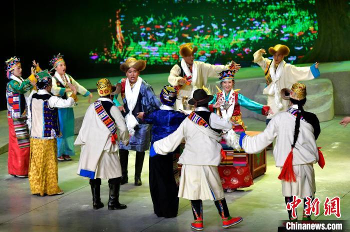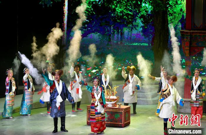7月13日晚,由西藏自治區(qū)藏劇團(tuán)打造的新編現(xiàn)實(shí)題材藏戲《綠色哈達(dá)》在拉薩開演。該劇將傳統(tǒng)藏戲元素與現(xiàn)代舞臺表現(xiàn)手法相結(jié)合,展現(xiàn)了西藏通過實(shí)施“一江兩河”等工程形成的高原生態(tài)治理成效。圖為演出現(xiàn)場。中新社記者 李林 攝
