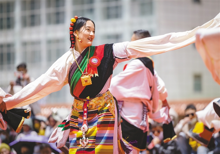 身著特色藏族服飾的巴青縣群眾在“鄉(xiāng)村振興 那曲奮進(jìn)”傳統(tǒng)舞蹈大賽上表演舞蹈。萬靖 攝