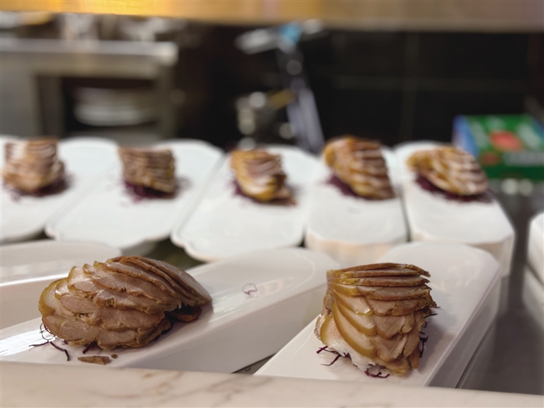 全聚德拉薩店選址于仙足島濱河路二期,店鋪設(shè)計(jì)匠心獨(dú)運(yùn),將古樸典雅的外部風(fēng)貌與簡(jiǎn)約優(yōu)雅的現(xiàn)代內(nèi)部裝飾巧妙融合。墻壁上隨處可見的掛畫在介紹著店鋪歷史的同時(shí),更為空間增添了一抹藝術(shù)氣息。開業(yè)當(dāng)天,隨著歡快的開場(chǎng)舞響起,慶典活動(dòng)正式拉開帷幕。現(xiàn)場(chǎng),片鴨師傅們以精湛的技藝展示著全聚德的獨(dú)特魅力,一只只色澤誘人的烤鴨在他們的巧手下化身為薄如蟬翼的鴨肉片,搭配新鮮的蔥絲、黃瓜條及特制甜面醬卷入薄餅中,一口咬下,鮮美與香甜在口中瞬間綻放,令人回味無(wú)窮。