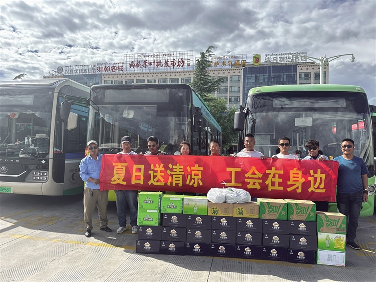 “快來(lái)吃點(diǎn)西瓜,喝點(diǎn)水休息一下吧?!?月17日,一陣溫馨的聲音傳入拉薩市公安局交警支隊(duì)城北大隊(duì)女子中隊(duì)及柳梧新區(qū)公交樞紐站堅(jiān)守在戶外崗位的勞動(dòng)者耳中。為了表達(dá)對(duì)一線民警和公交車司機(jī)的敬意和關(guān)懷,拉薩市總工會(huì)為交警和60名駕駛員送上飲料、水果等夏日解暑“利器”,送上關(guān)愛(ài)的同時(shí),對(duì)高溫下仍堅(jiān)守崗位、戰(zhàn)斗在執(zhí)勤執(zhí)法第一線的民輔警所做的貢獻(xiàn)表示誠(chéng)摯感謝;叮囑駕駛員要好好保重身體,注意勞逸結(jié)合,不要疲勞上崗,在做好工作的同時(shí),做好自身防暑降溫工作,安全度夏、清涼度夏。