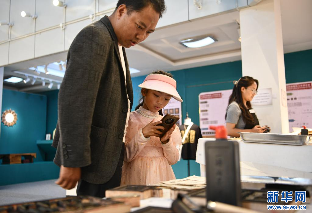 7月19日,一名小朋友在家長(zhǎng)陪同下拍攝感興趣的西藏雕版印刷品。