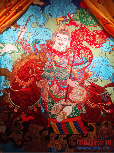 圖為羅布堆繡唐卡作品《格薩爾王》局部。 中國(guó)經(jīng)濟(jì)網(wǎng)記者 魏金金/攝