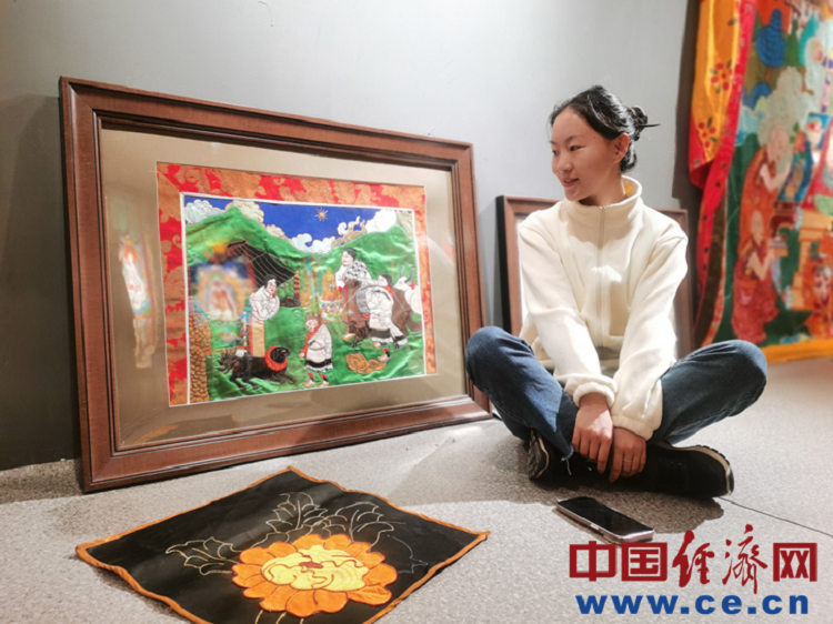 圖為巴桑德吉和她的《羌塘牧區(qū)圖》堆繡裝飾畫。 中國(guó)經(jīng)濟(jì)網(wǎng)記者魏金金/攝