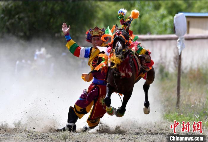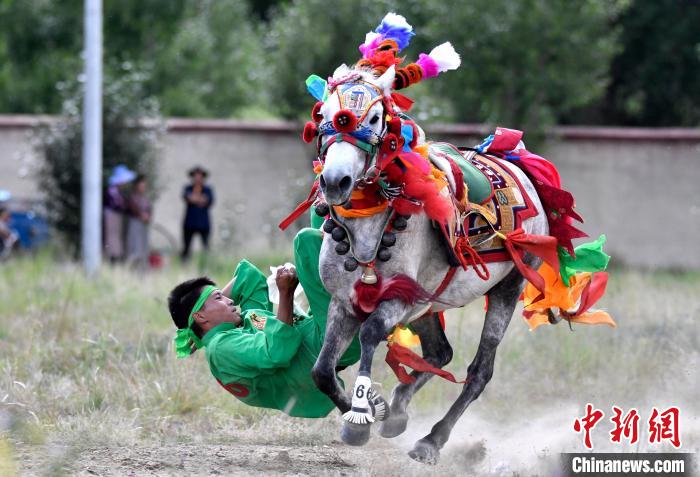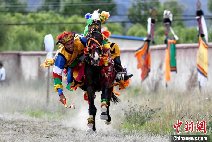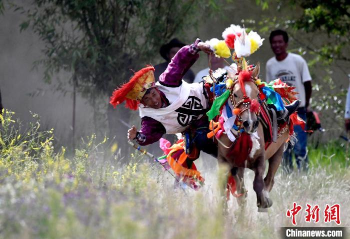 7月27日,西藏拉薩市桑達村迎來“望果節(jié)”,村民們舉行賽馬活動慶祝?!巴?jié)”是西藏傳統(tǒng)的豐收節(jié),具體日期隨各地莊稼成熟的時間而變化?!巴?jié)”期間,按照習俗,各地都會舉辦賽馬比賽。圖為騎手進行馬術(shù)表演。中新社記者 李林 攝