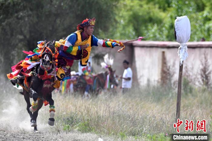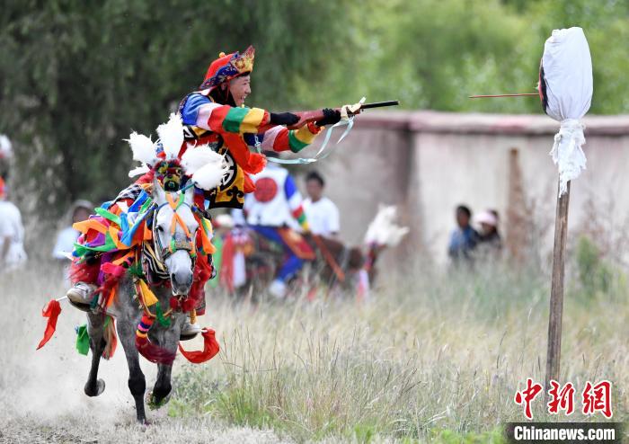 7月27日,西藏拉薩市桑達村迎來“望果節(jié)”,村民們舉行賽馬活動慶祝?!巴?jié)”是西藏傳統(tǒng)的豐收節(jié),具體日期隨各地莊稼成熟的時間而變化。“望果節(jié)”期間,按照習俗,各地都會舉辦賽馬比賽。圖為騎手進行馬上射擊表演。中新社記者 李林 攝