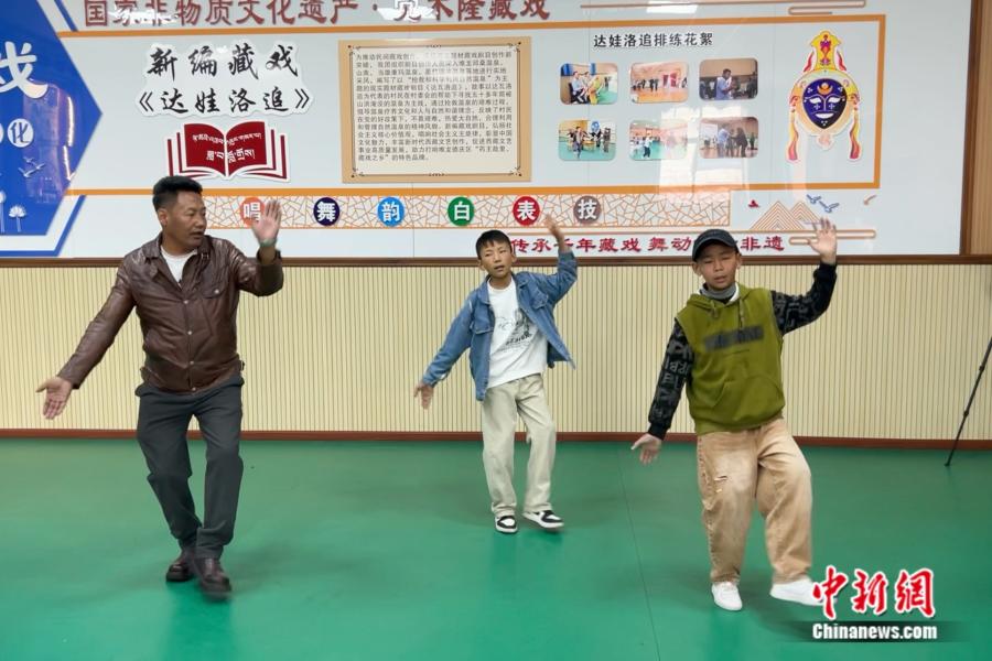 洛桑扎西現(xiàn)場指導藏戲小學員洛桑(右一)。 中新網(wǎng)記者 陳文韜 攝