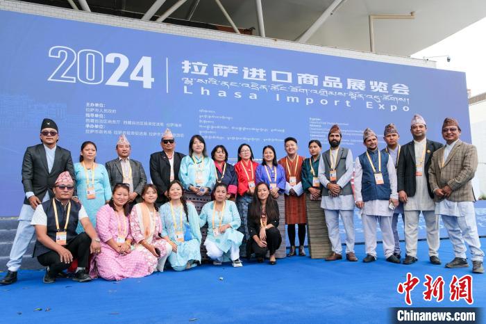 8月4日,來自尼泊爾和不丹的參展商在拉薩進口商品展覽會開幕式現場合影留念。中新社記者 江飛波 攝