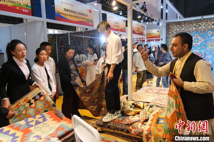 來自阿富汗喀布爾的商人阿明扎伊·穆罕默德·賈(Aminzai Mohammad Jan)主要銷售阿富汗毛毯等手工藝品,這是他第二次進藏展銷?,F場,阿明扎伊·穆罕默德·賈十分忙碌,不斷為顧客挑選合適的款式和花色,顧客砍價時,他便掏出手機播放毛毯的制作過程。他說,期待這次銷量更好。