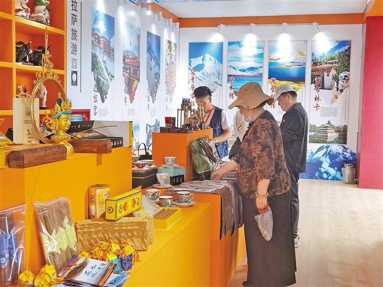 第二屆西藏文化藝術(shù)節(jié)期間,游客在參觀非遺文創(chuàng)產(chǎn)品。記者 鄭璐 袁海霞 攝