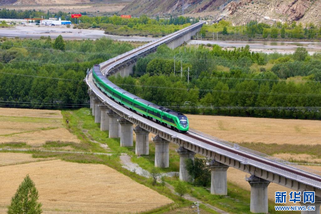 復(fù)興號(hào)動(dòng)車組穿過拉日鐵路拉薩河大橋。新華社發(fā)(馬生明 攝)