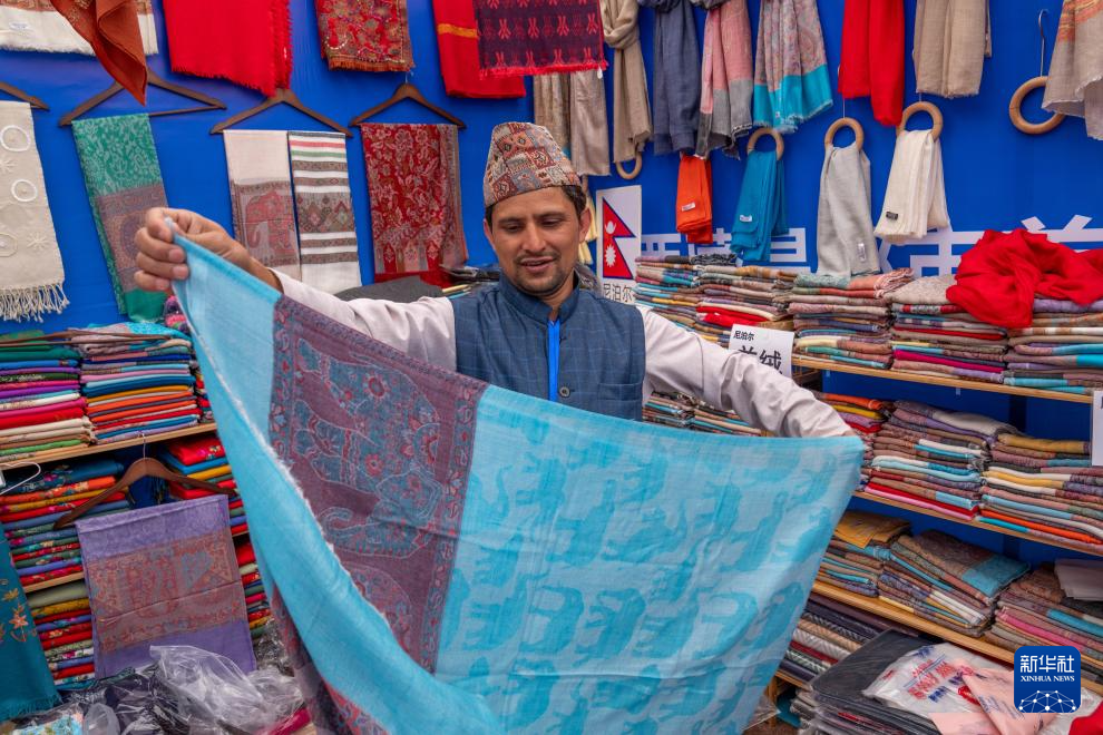 來自尼泊爾的商人蘇雷什·達卡爾在介紹他的披肩(8月19日攝)。新華社記者 旦增尼瑪曲珠 攝