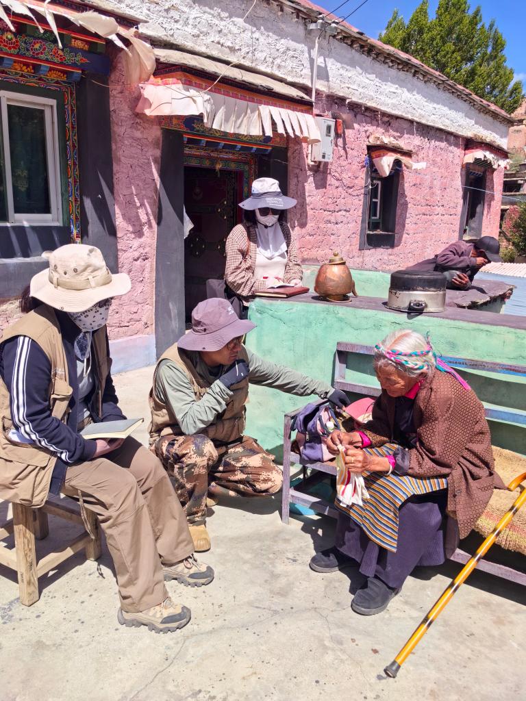 普查隊(duì)員在山南市曲松縣曲松鎮(zhèn)瓊嘎村向當(dāng)?shù)乩先俗稍冊(cè)摯鍤v史文化情況。(受訪者供圖)