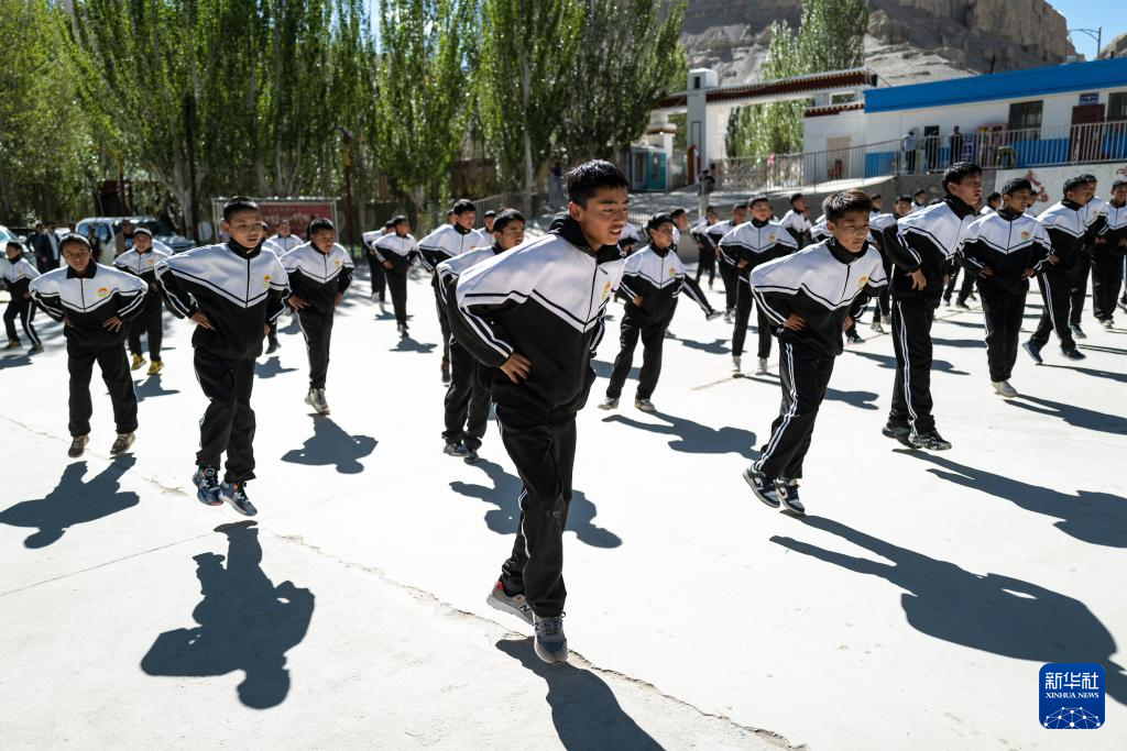 在西藏阿里地區(qū)札達(dá)縣九年一貫制學(xué)校,孩子們跳起融入國(guó)家級(jí)非物質(zhì)文化遺產(chǎn)“宣舞”特色的課間操(9月10日攝)。新華社記者 孫瑞博 攝