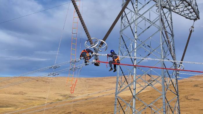 9月的林周,高原的陽光刺得睜不開眼。在走線現(xiàn)場,小組負責(zé)人扎西頓珠指揮兩名工作人員上塔進行懸掛接地線,隨后,兩名走線人員頂著強烈的紫外線對2329號至2325號鐵塔開展線路走線工作,在走線過程中,他們認真檢查導(dǎo)線有無磨損、斷股、嚴重銹蝕、外層損傷、零部件缺失等缺陷。現(xiàn)場走線組負責(zé)人扎西頓珠向記者介紹“在高海拔、大溫差、強風(fēng)沙的氣候環(huán)境下,設(shè)備長期暴露在外,受到風(fēng)吹日曬雨淋,為精準掌握設(shè)備狀況,每年年檢都要開展走線消缺工作?!?/p>