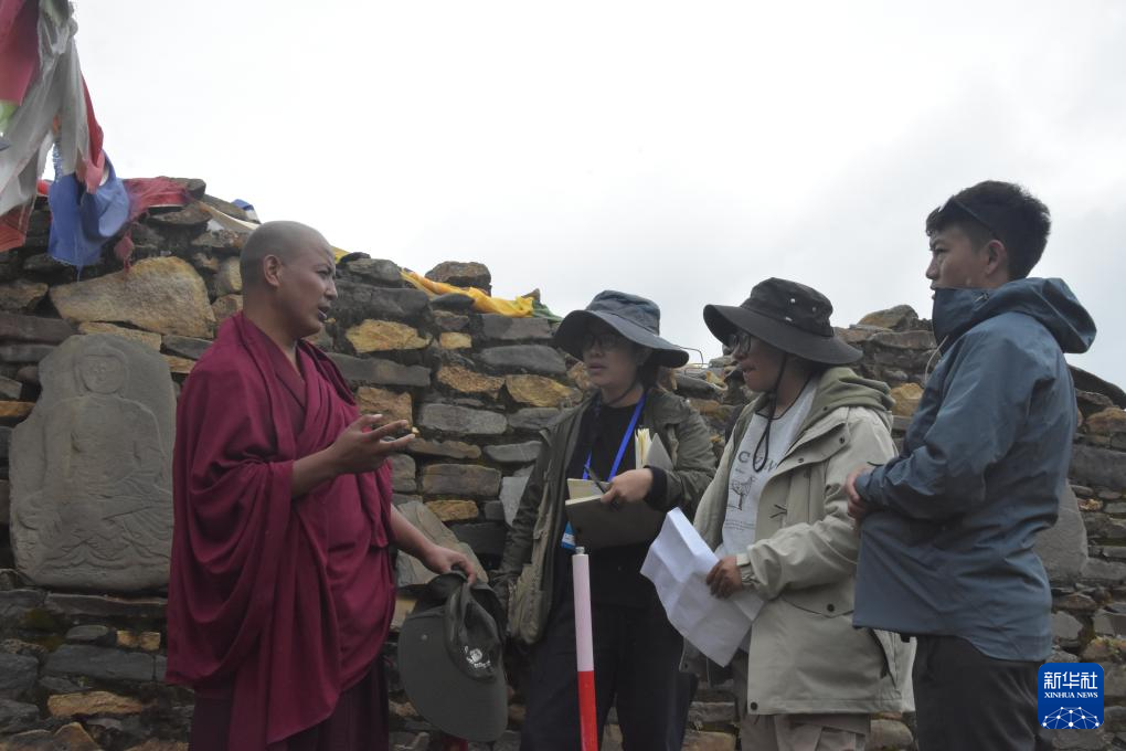 普查隊(duì)員正在向了解當(dāng)?shù)貧v史文化的僧人咨詢塔巴遺址歷史沿革。新華社記者 春拉 攝