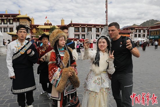 9月2日,西藏拉薩市八廓街,來自俄羅斯的巴德里(右一)與身穿藏族傳統(tǒng)服裝的年輕游客合影留念。近年來,來拉薩旅游,到八廓街、布達拉宮廣場拍一套藏服寫真,已經(jīng)成為進藏旅游年輕人的“標配”。中青報·中青網(wǎng)記者 孔斯琪/攝