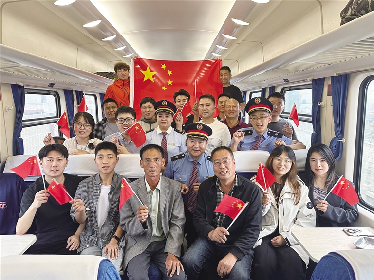 列車員與旅客合影慶祝國慶節(jié)。圖由周悅翔 楊寶森提供