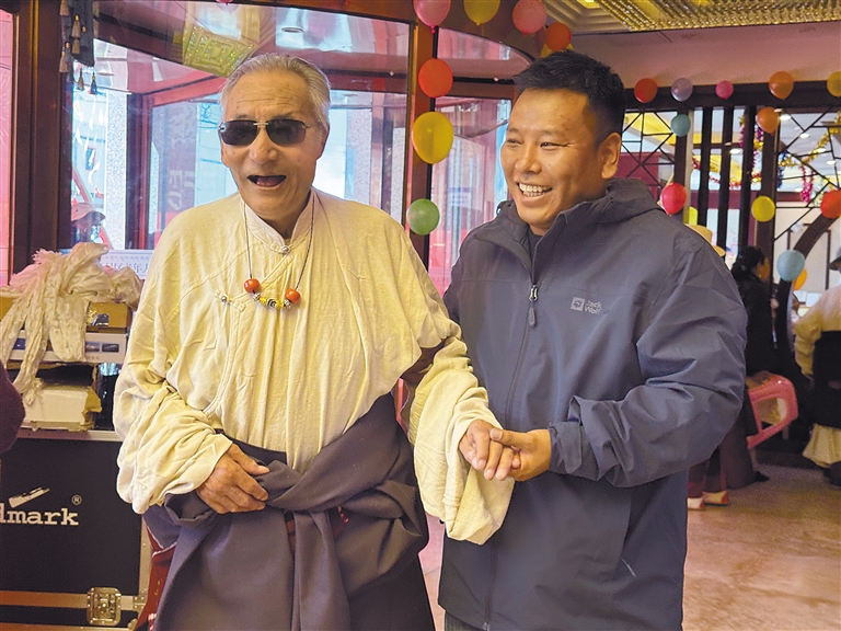 尼瑪是國家級非物質(zhì)文化遺產(chǎn)代表性項目卓舞(瓊結(jié)久河卓舞)國家級代表性傳承人。演出中,他擔(dān)任“卓本”(領(lǐng)舞者)角色,協(xié)調(diào)整個團隊11人的舞蹈動作和節(jié)奏?!拔矣H歷西藏翻天覆地的變化,看到如今的盛世,叫我們怎能不歌唱!”面對人們對他不顧年事“執(zhí)著”舞臺的疑問和驚嘆,尼瑪感嘆道。