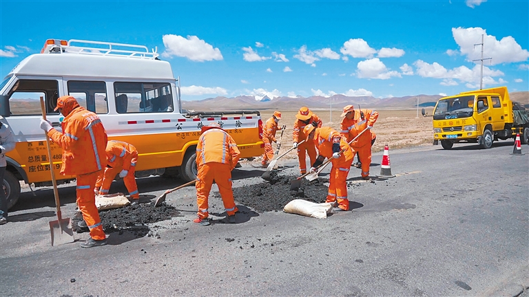 “我們養(yǎng)護(hù)的這段公路,每年只有兩個季節(jié),冬季和夏季。冬季漫長,主要的工作是鏟雪保通;夏季短暫,主要就是不斷填坑鋪油?!钡馗赂嬖V記者,青藏公路長期承擔(dān)著進(jìn)出藏物資運(yùn)輸重任,每天進(jìn)出藏車流量大。養(yǎng)護(hù)保通工作雖然單調(diào),但大家都明白這份工作的重要性。