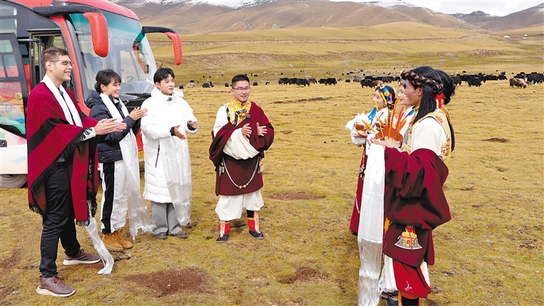 圖為貢覺縣群眾迎接“乘著大巴看中國·西藏行”活動參加人員。記者 貢秋曲措 攝