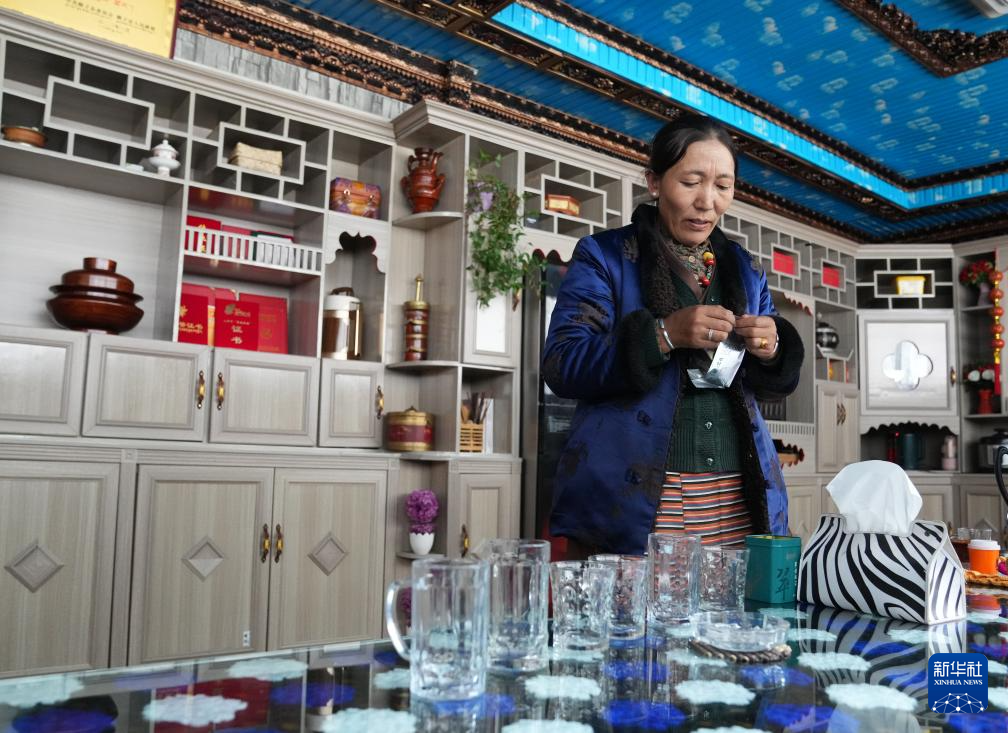 紐林塘村村民格桑卓瑪在家中為客人沏茶(10月14日攝)。新華社記者 丁汀 攝