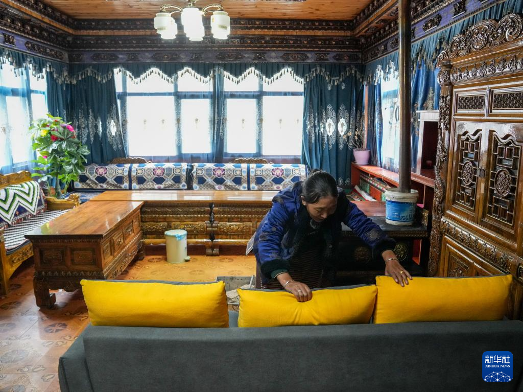 紐林塘村村民格桑卓瑪在整理客廳(10月14日攝)。新華社記者 丁汀 攝