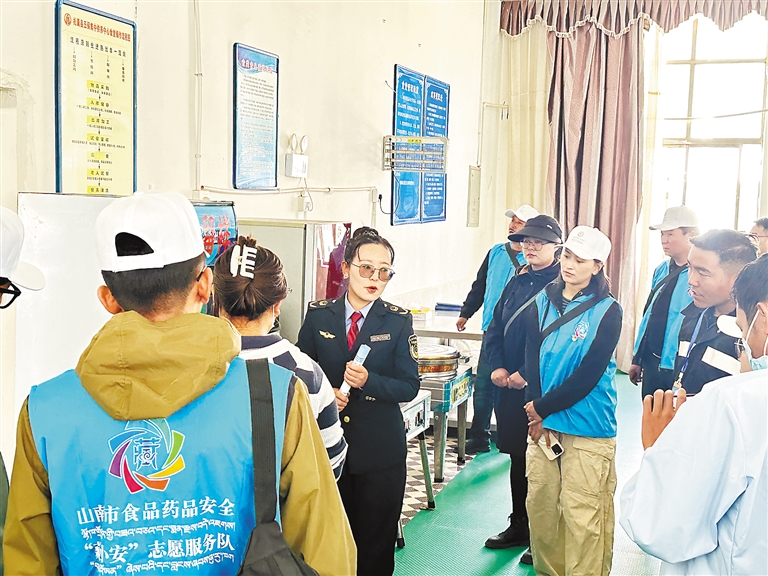 山南市市場監(jiān)管執(zhí)法人員向食品藥品安全志愿服務隊講解食品安全檢查相關內容。記者 巴桑旺姆 攝