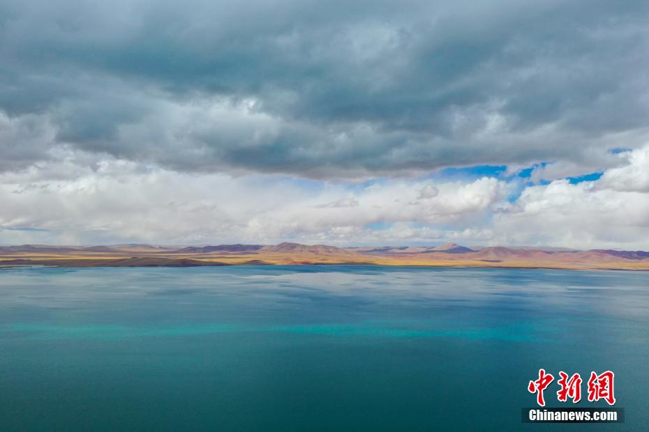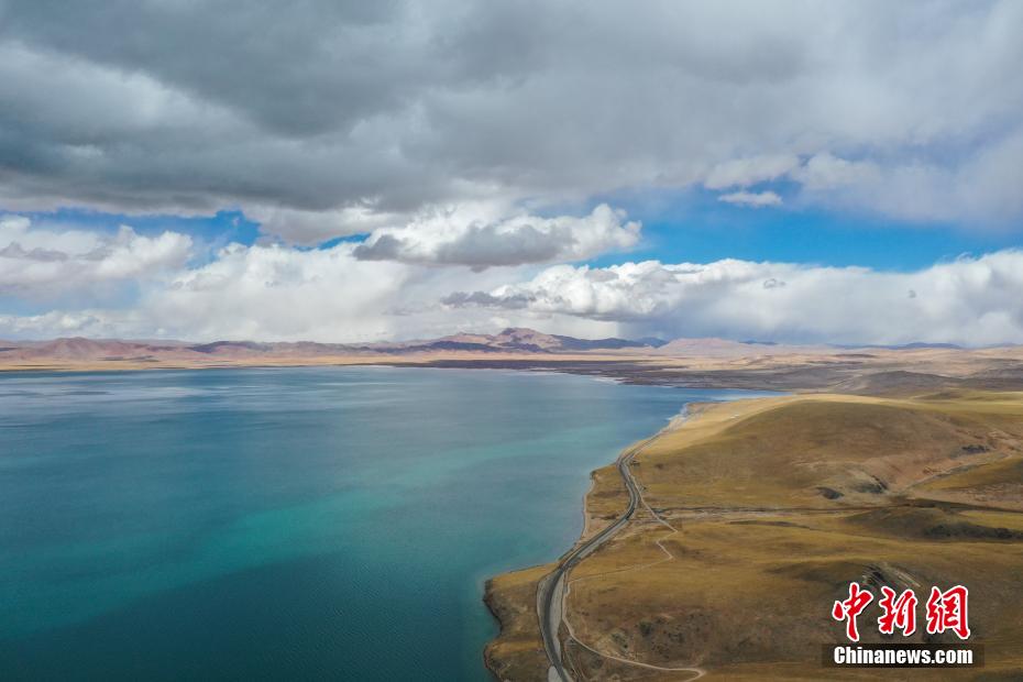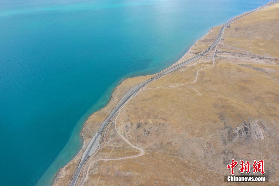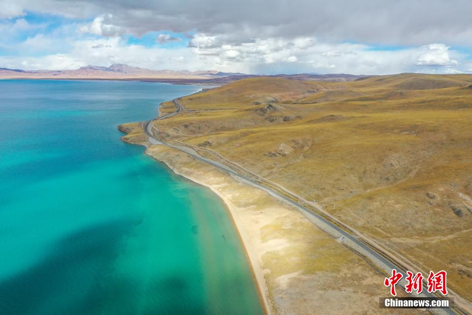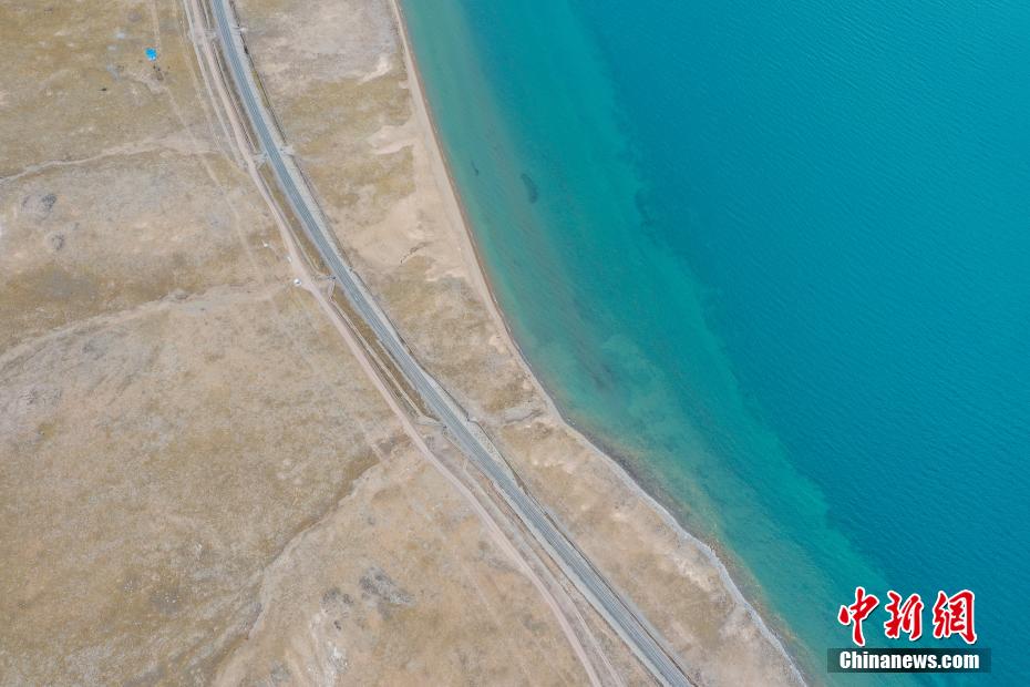 10月24日,鳥(niǎo)瞰深秋時(shí)節(jié)的錯(cuò)那湖,美景如畫(huà)。錯(cuò)那湖位于西藏自治區(qū)那曲市安多縣境內(nèi),是怒江的源頭湖。湖水在陽(yáng)光的照耀下,波光粼粼,湖岸線(xiàn)蜿蜒曲折,與周?chē)纳矫}、鐵路、草原共同描繪出一幅美麗的畫(huà)卷。中新社記者 貢嘎來(lái)松 攝