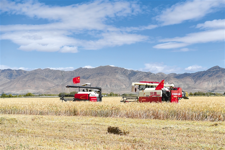 配圖:日喀則市白朗縣巴扎鄉(xiāng)農(nóng)機合作社的村民進行機械化收割。(資料圖片)記者 李洲 攝