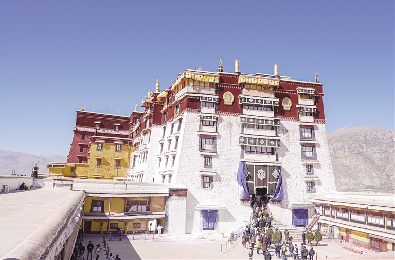 據(jù)了解,按照習俗慣例,每年藏歷九月前后,拉薩河谷地區(qū)雨季結(jié)束,天氣還沒完全變冷之前,布達拉宮就會開始一年一度的粉刷工作。從17世紀開始,粉刷布達拉宮已是300多年的傳統(tǒng)。布達拉宮每年的刷墻,是為了保護布達拉宮墻體結(jié)構(gòu),有效阻隔建筑外觀被風吹日曬、雨水沖刷等自然侵蝕,同時也能避免外墻顏料脫落,墻體結(jié)構(gòu)老化等現(xiàn)象,確保布達拉宮建筑外觀能夠重煥新顏,保持靚麗如初的顏色。